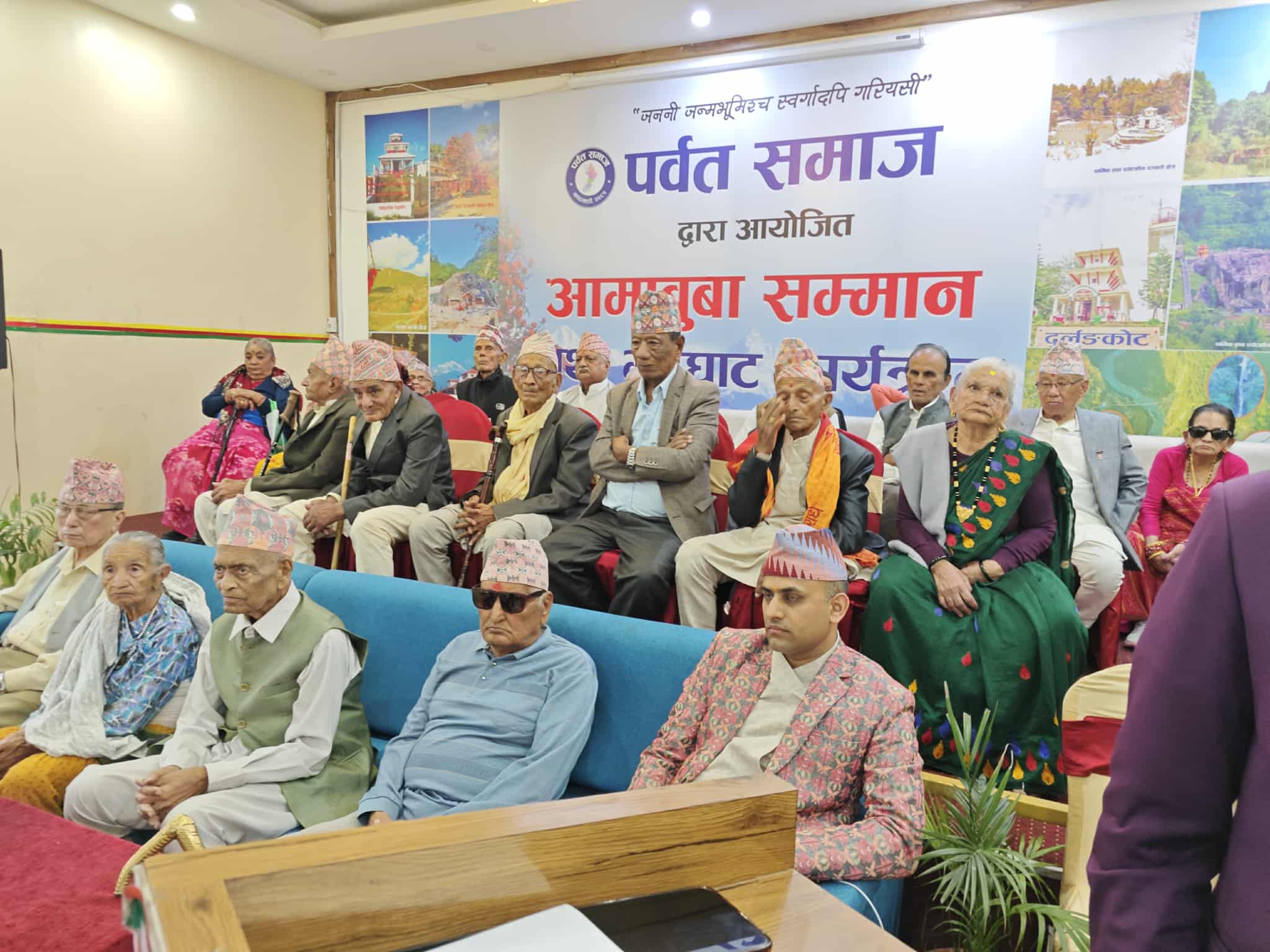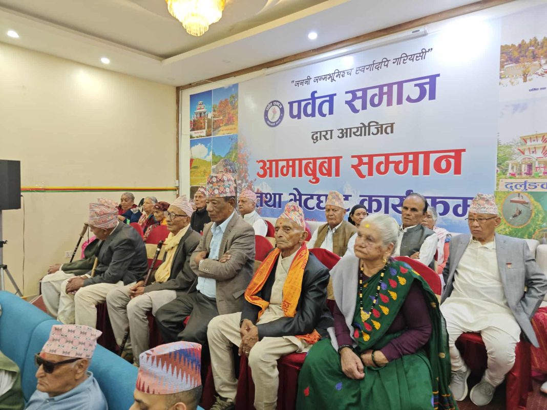 समाजले सोमबार काठमाडौंको हात्तिसारस्थित नेपाल हाउसमा ‘आमाबुबा सम्मान तथा भेटघाट कार्यक्रम” आयोजना गरी पर्वतबाट काठमाडौं आएर बसोबास गर्दै आउनुभएका आमा बुबालाई सम्मान गरेको हो।